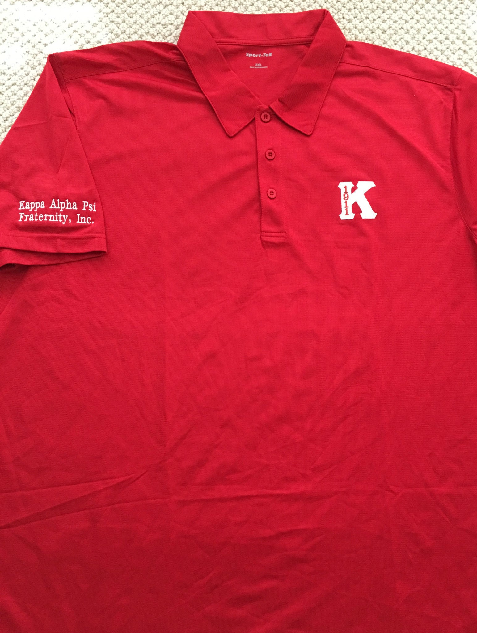 Dri-Fri Polo with embroidered 2 inch letter and year. Right sleeve embroidered with name of organization.